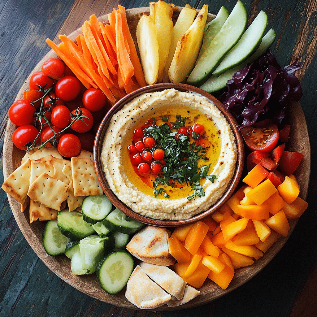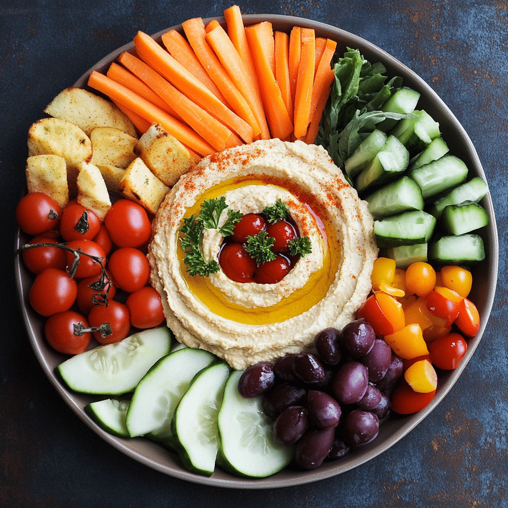 I remember the first time I put together a Hummus and Veggie Platter for a casual get-together. The bright colors and variety of textures made it a show-stopper, and it was one of the first dishes to disappear. What I love most about this platter is how easy it is to adapt—add crunchy carrots, cucumbers, and bell peppers, or throw in cherry tomatoes, radishes, and snap peas for even more variety. You can also pair it with warm pita bread, crispy pita chips, or even breadsticks for a hearty touch.