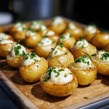 - Serve: Arrange the mini baked potatoes on a serving platter, and garnish with fresh herbs, if desired. Serve immediately while warm!